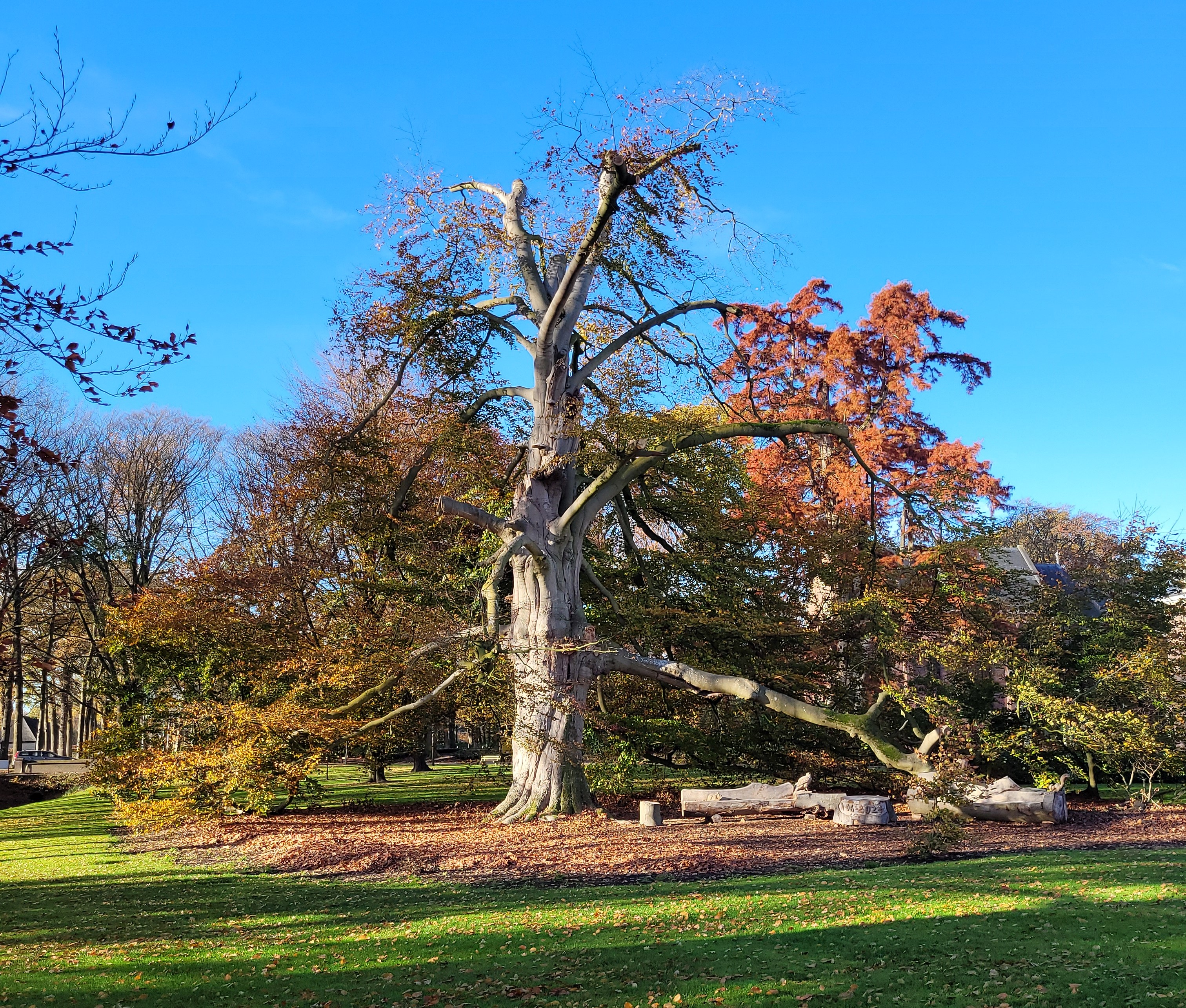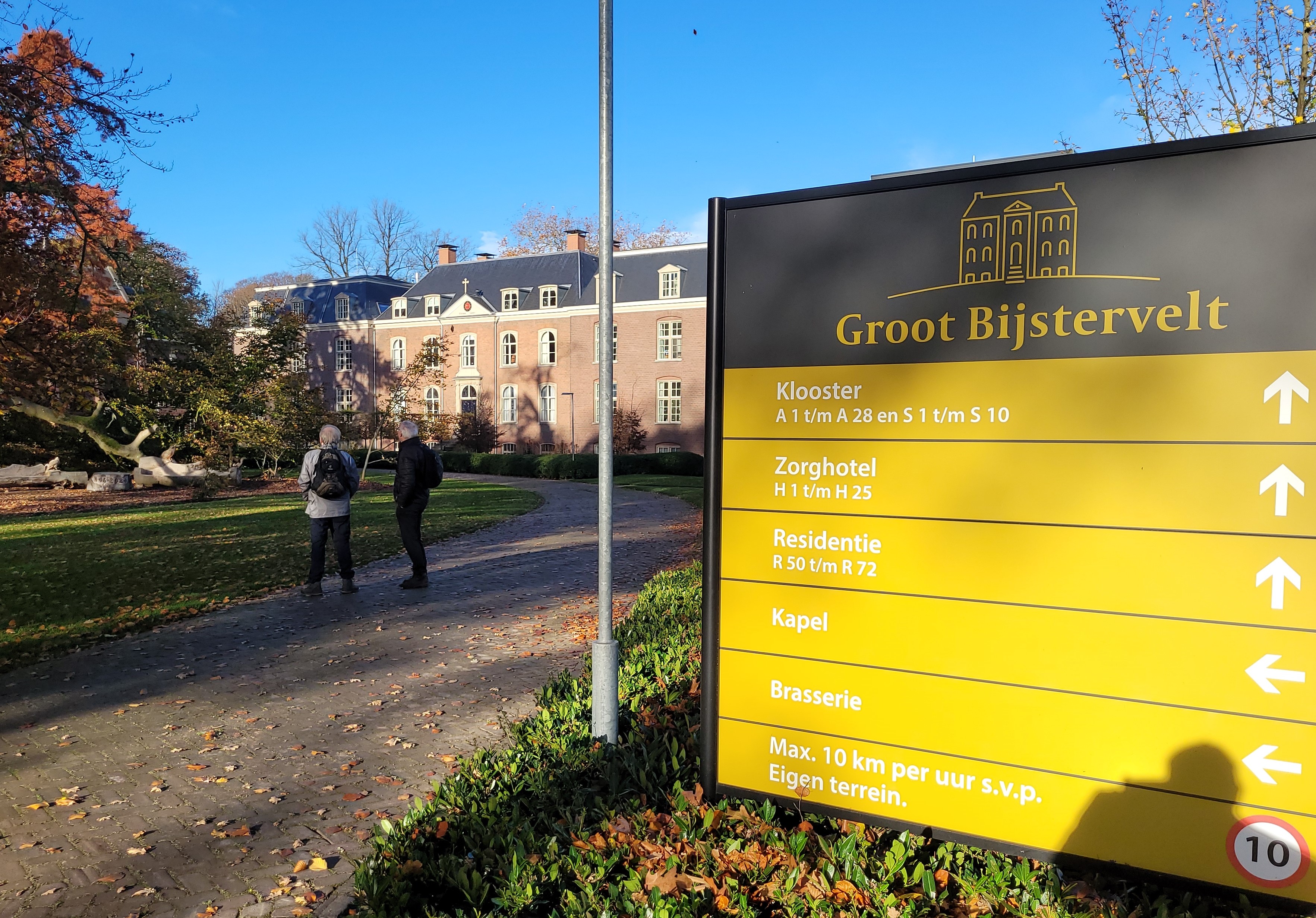 Voor het hoofdstuk van de dag togen we naar Oirschot. Aldaar parkeerden en startten we bij een overblijfsel uit verleden tijden, het Rijke Roomse Leven, inmiddels omgebouwd en uitgebreid tot een moderne zorginstelling en résidence, waar de uitbaters, volgens hun website ” zorgeloos zorgen en ontzorgen”. Dat goldt kennelijk niet voor de majestueuze boom op het voorplein die wat ledematen was kwijt geraakt.