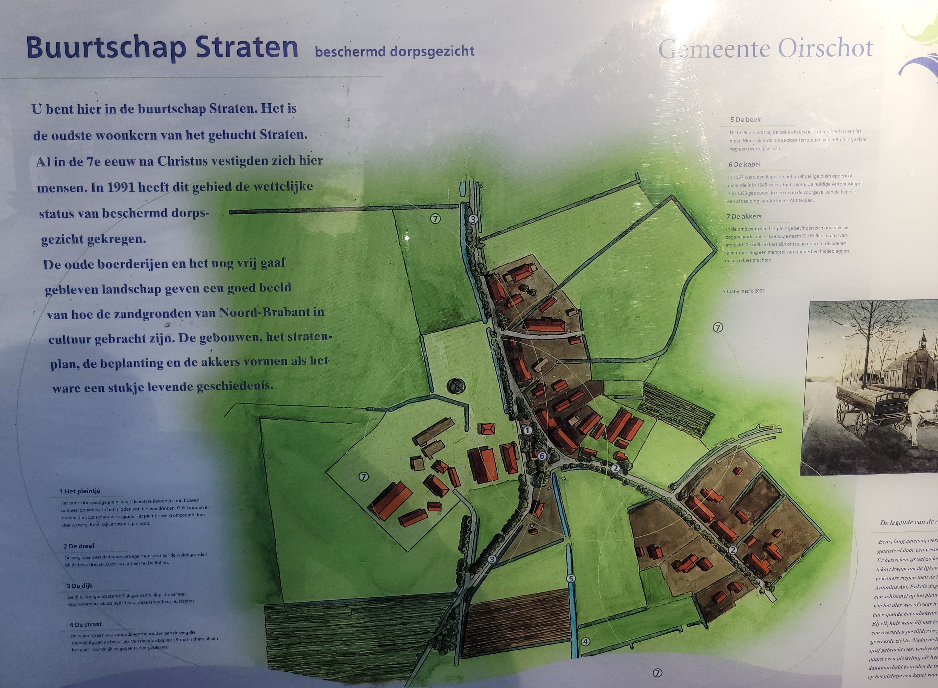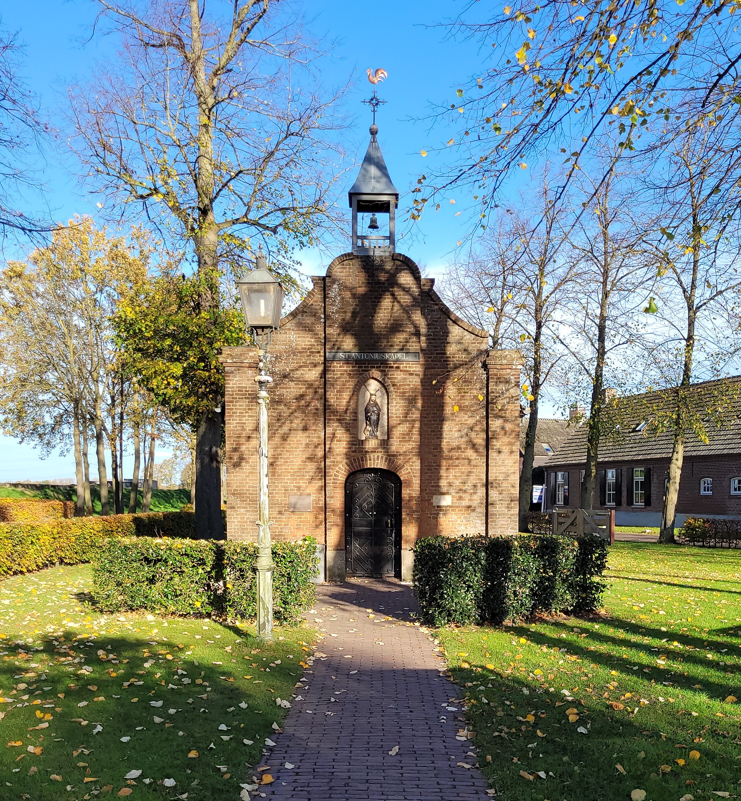Wij gingen zorgeloos vanuit onszelf op pad. Bij het passeren van een buurtschap Straten werd ons duidelijk gemaakt dat dit gehucht een bijzondere status heeft: beschermd dorpsgezicht. De Sint Antonius Kapel past daar naadloos in. Verder lopend werden we plotseling belaagd door een hoen dat uit de heg tevoorschijn schoot. Daarbij bleef het niet: er sprongen er daarna nog wat meer uit de heg. Omdat de openbare weg een slechte verblijfplaats is voor zulke fraaien hoenen (ze zijn zo mooi dat ze uitstijgen boven de kwalificatie “kip”) werden ze door Ruud met vaste hand, bijna vakbekwaam, naar een veiliger plek gedreven.