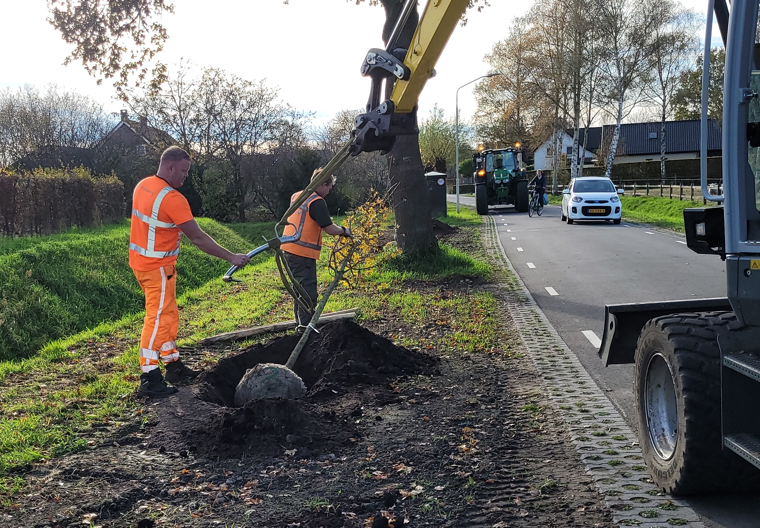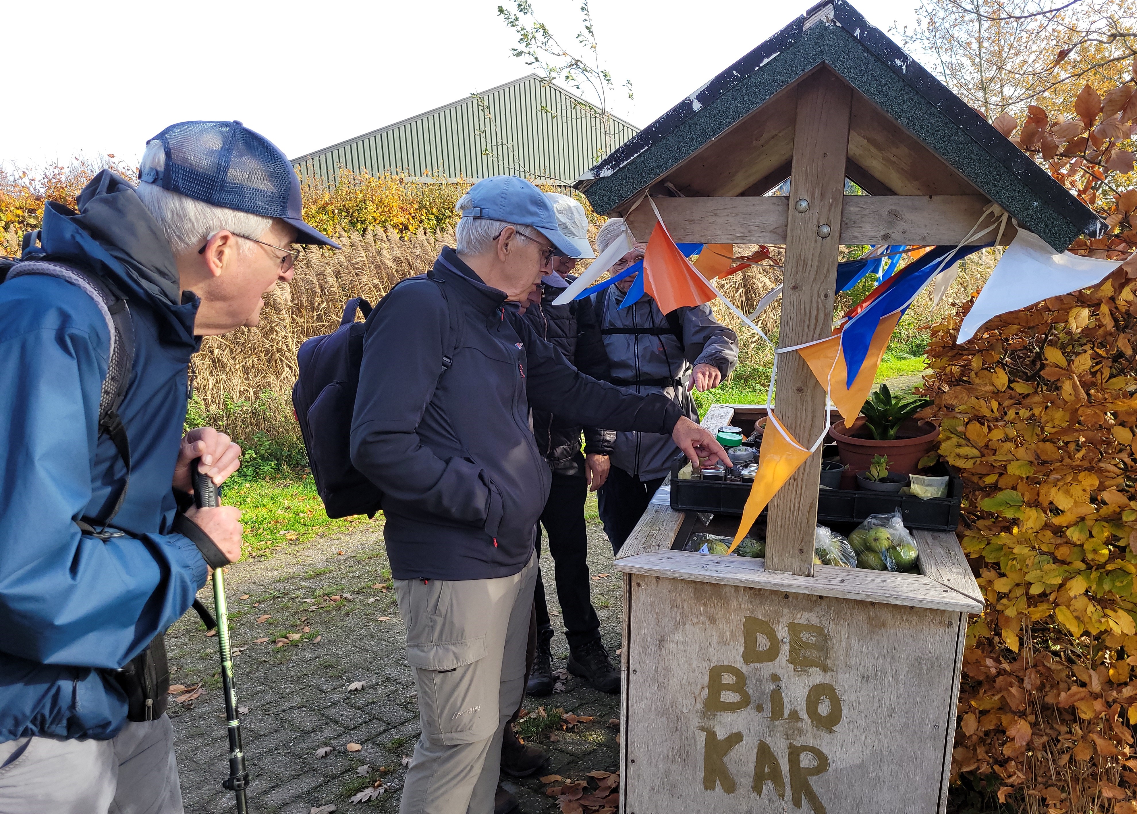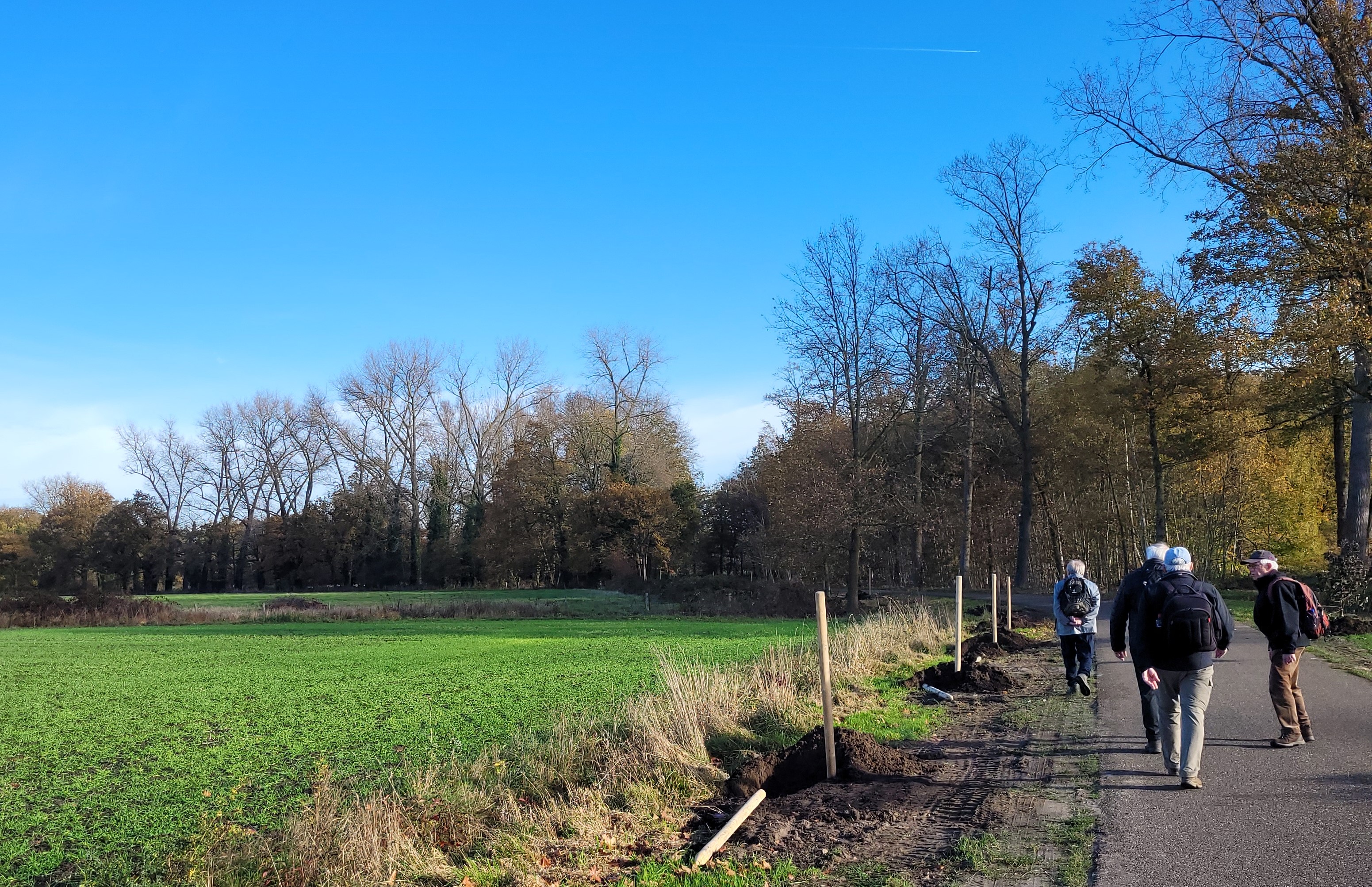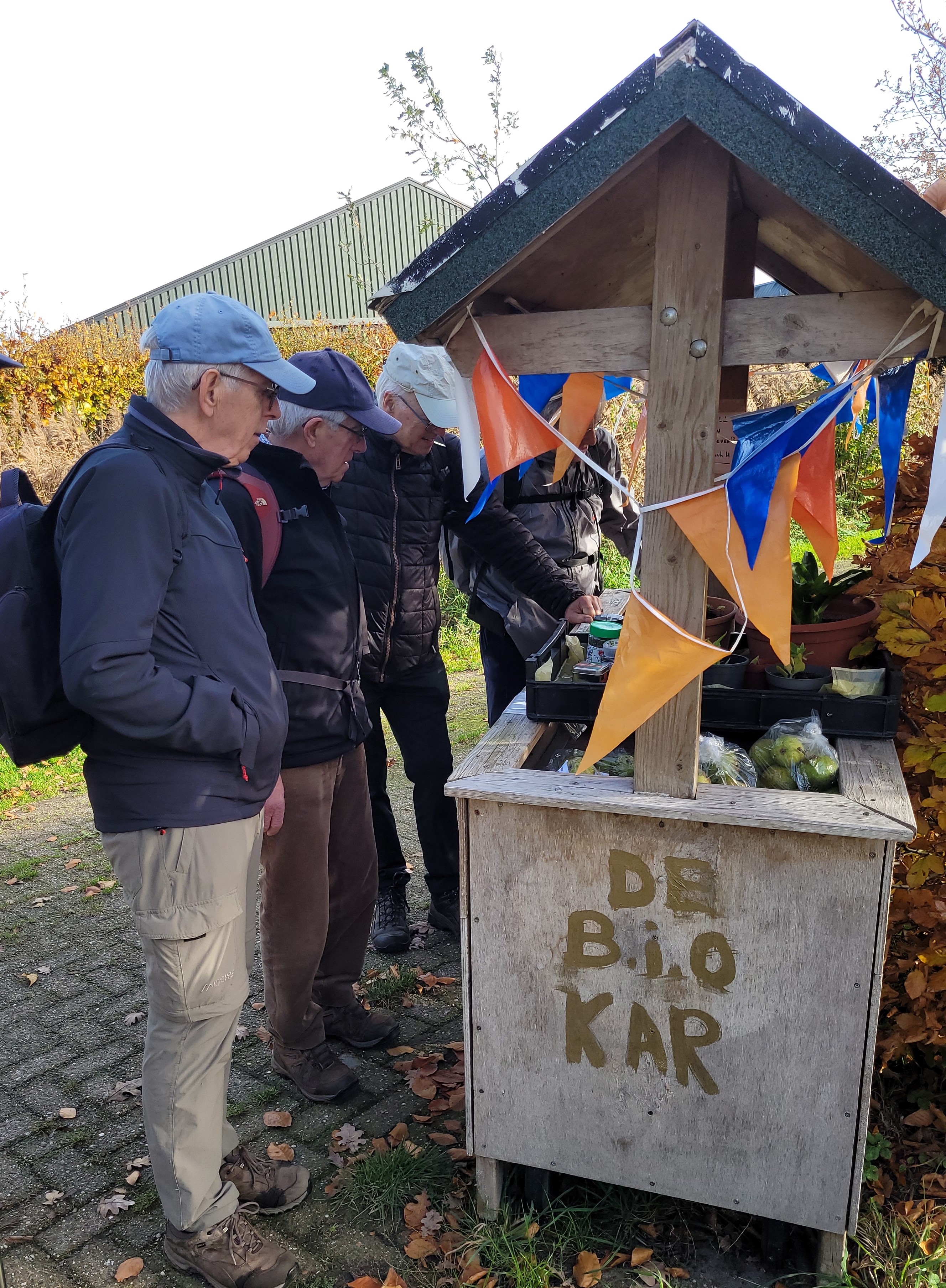We bezochten de mobiele supermarkt, De Bio Kar, maar deden geen boodschappen. Op het laatste deel van het traject troffen we de bomenplanters die we in het begin van de wandeling al wat verder weg hadden gezien. Eén van de noeste werkers vertelde dat ze in totaal 800 bomen moesten plaatsen om de buitenwegen van Oirschot weer een mooie aanblik te geven. Hij keek er vergenoegd bij want hij dacht natuurlijk aan de mooie omzet voor zijn bedrijf.