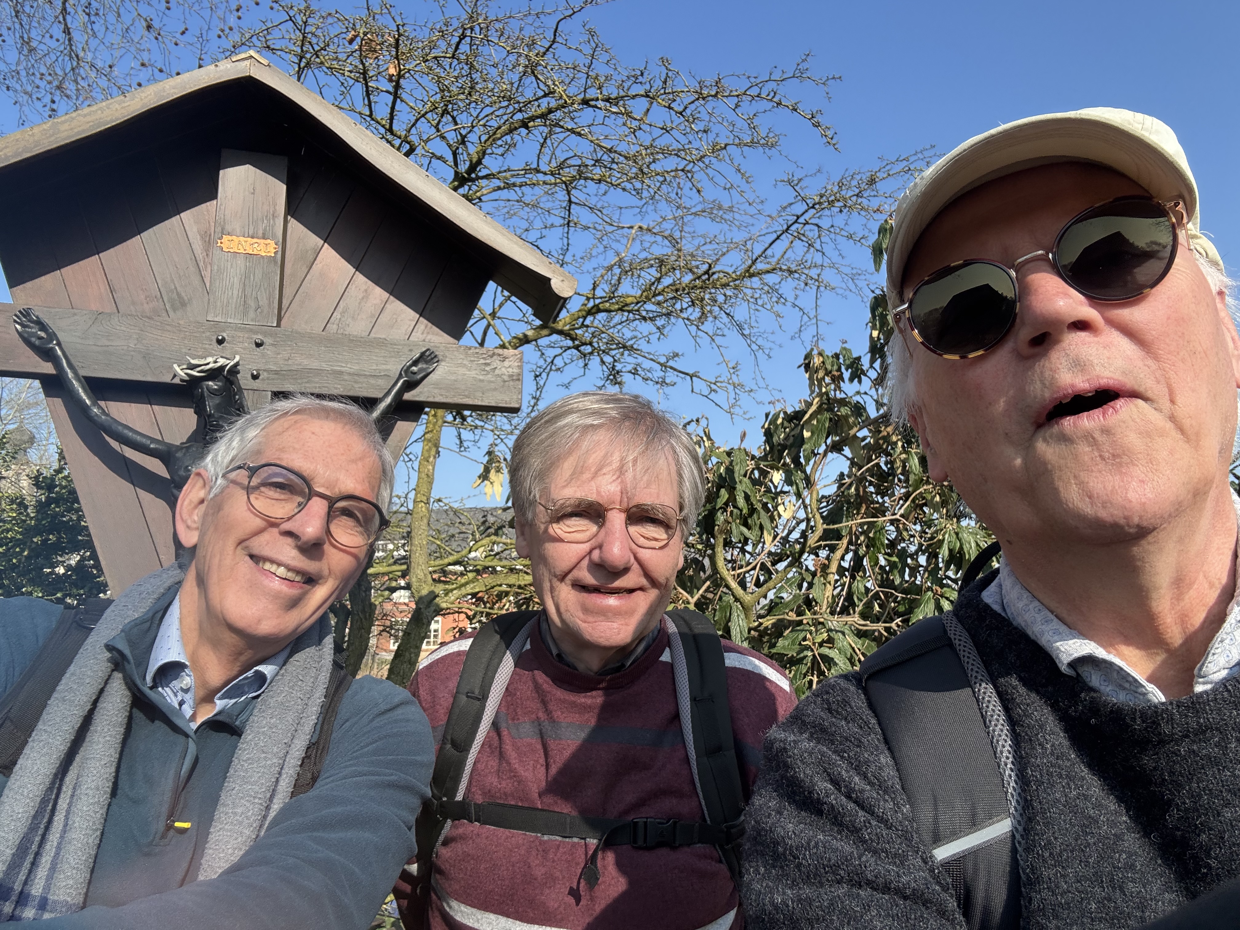 Na ruim twee uur wandelen zijn wij weer terug bij het startpunt in Halder. Ongeveer 7 km gelopen. Een heerlijke wandeling. Geen wonder, getuige de laatste selfie van ons drieën, waar we verkeren in goed gezelschap.